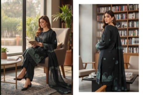 This premium Jacquard Lawn 3-piece suit combines comfort with elegance. The shirt is crafted from soft, breathable lawn with intricate jacquard patterns and subtle embroidery, giving it a refined summer-ready look. The matching lawn dupatta adds grace, while the trouser completes the ensemble. Ideal for daily wear, gatherings, or summer occasions, this suit offers effortless style and all-day comfort. Easy to maintain and perfect for a chic, breezy summer wardrobe.
